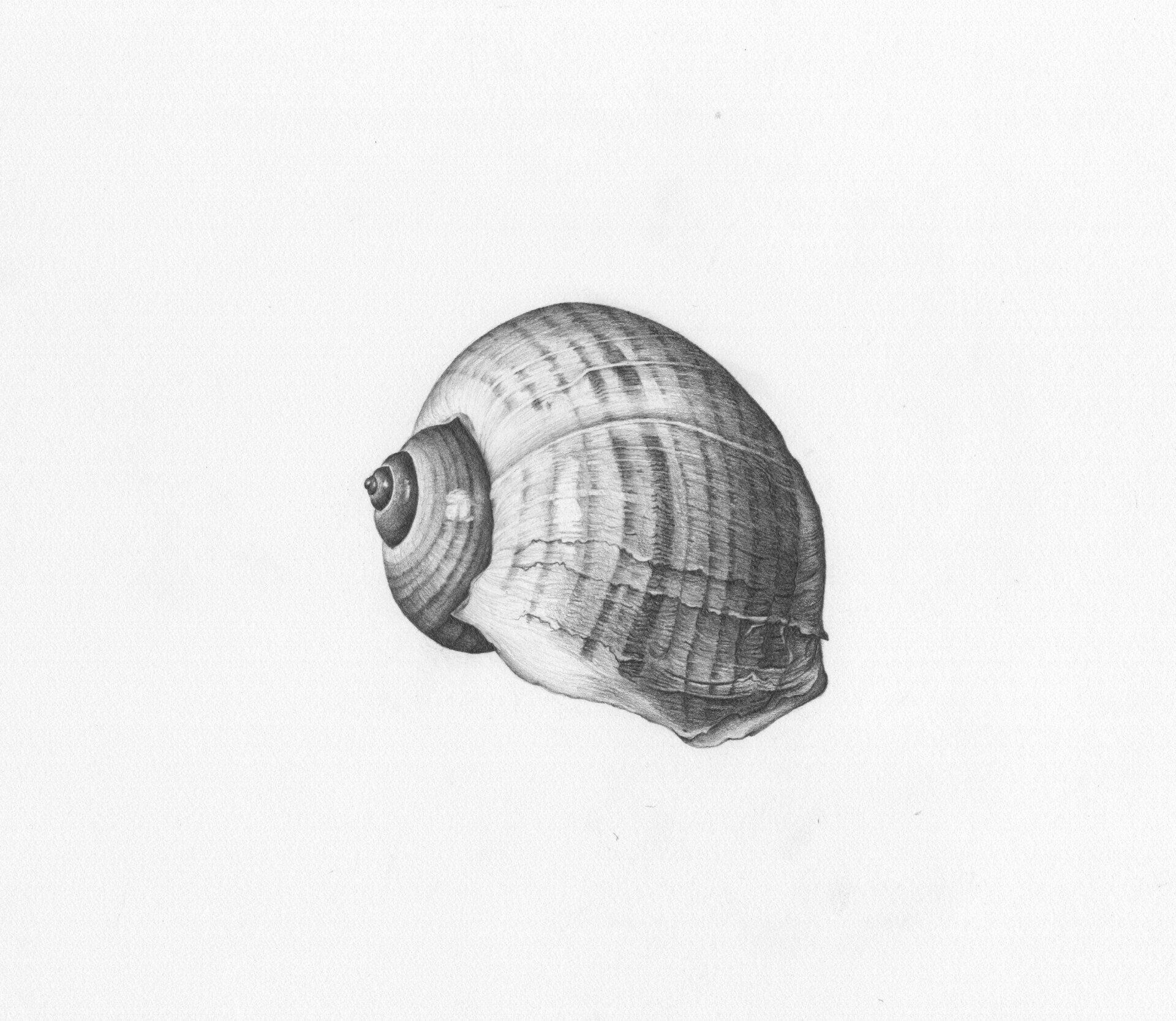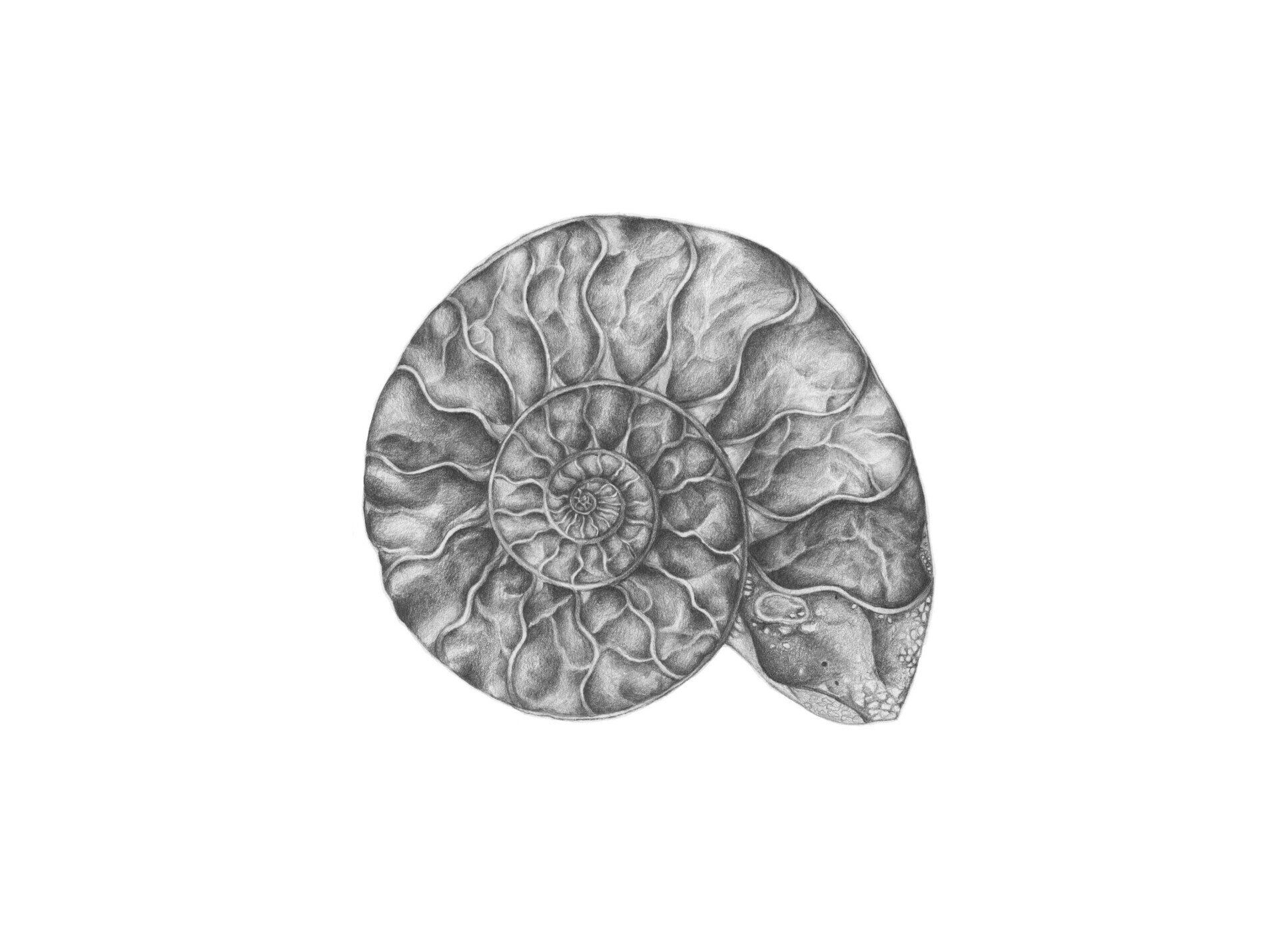 Ammonites are shelled cephalopods that have been extinct for 66 million years. Graphite on paper. Size 8.9 in x 12 in.