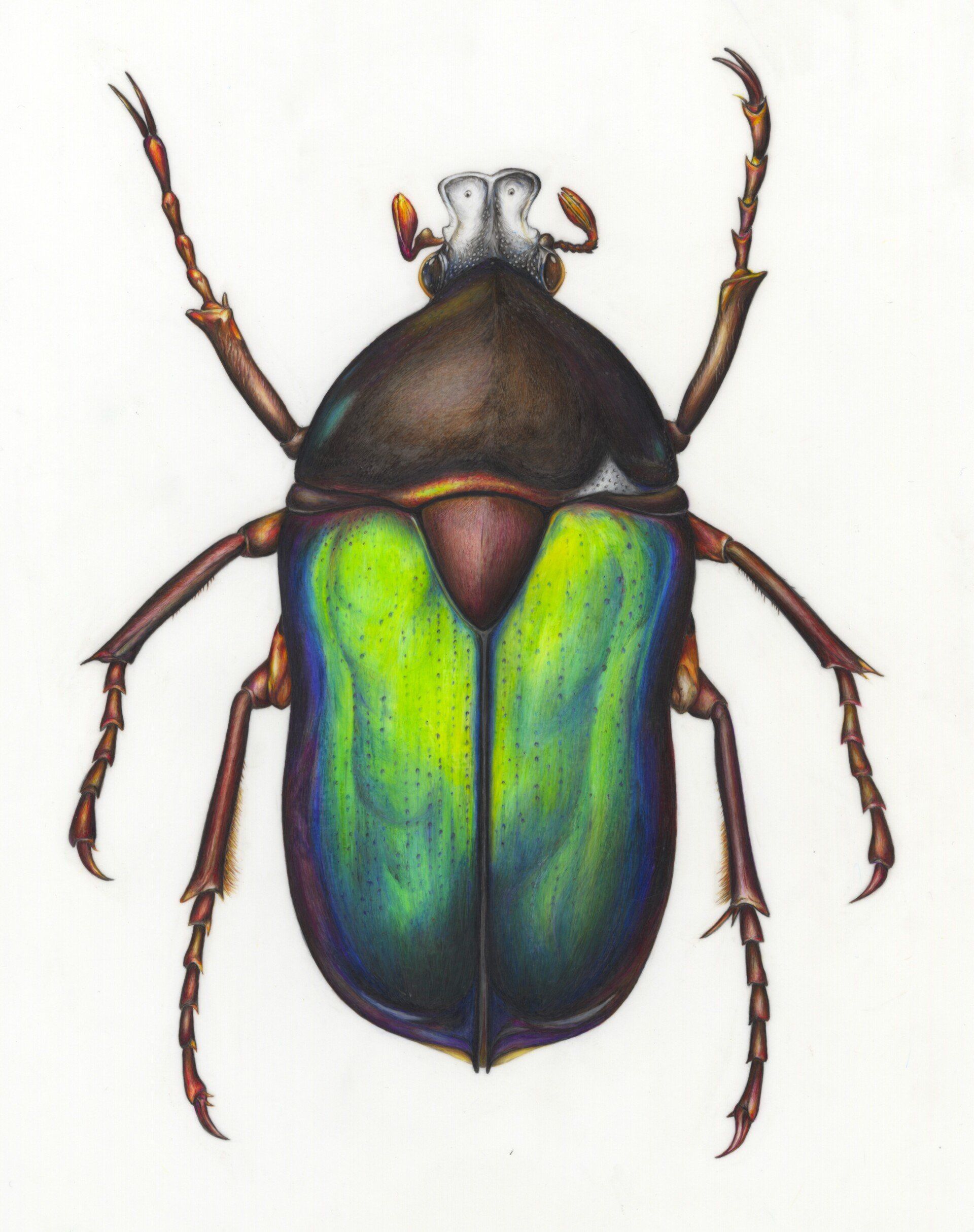 Cantao ocellatus is a species of shield bug in the family Scutelleridae found across Asia. Reddish or ochre in overall colour it has dark legs and bluish black antennae. Colored pencil on drafting film. Size 11.7 in x 8.5 in.