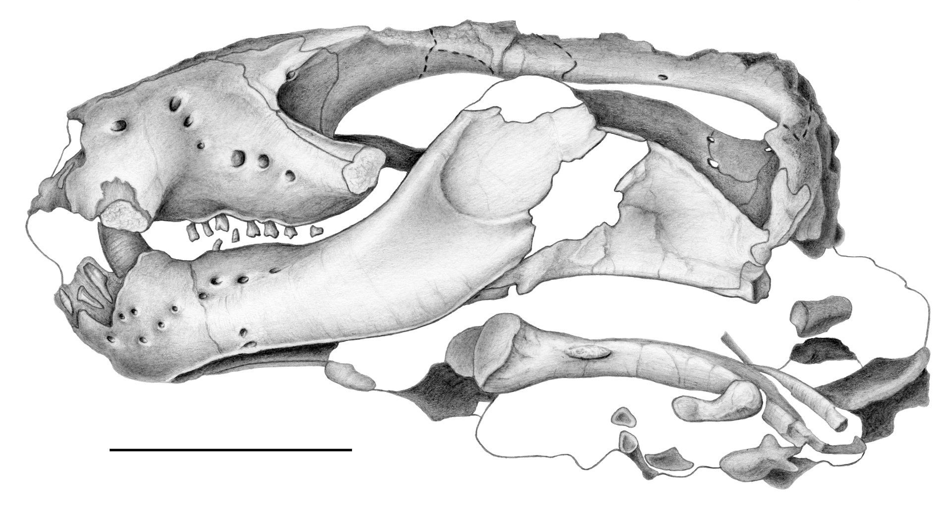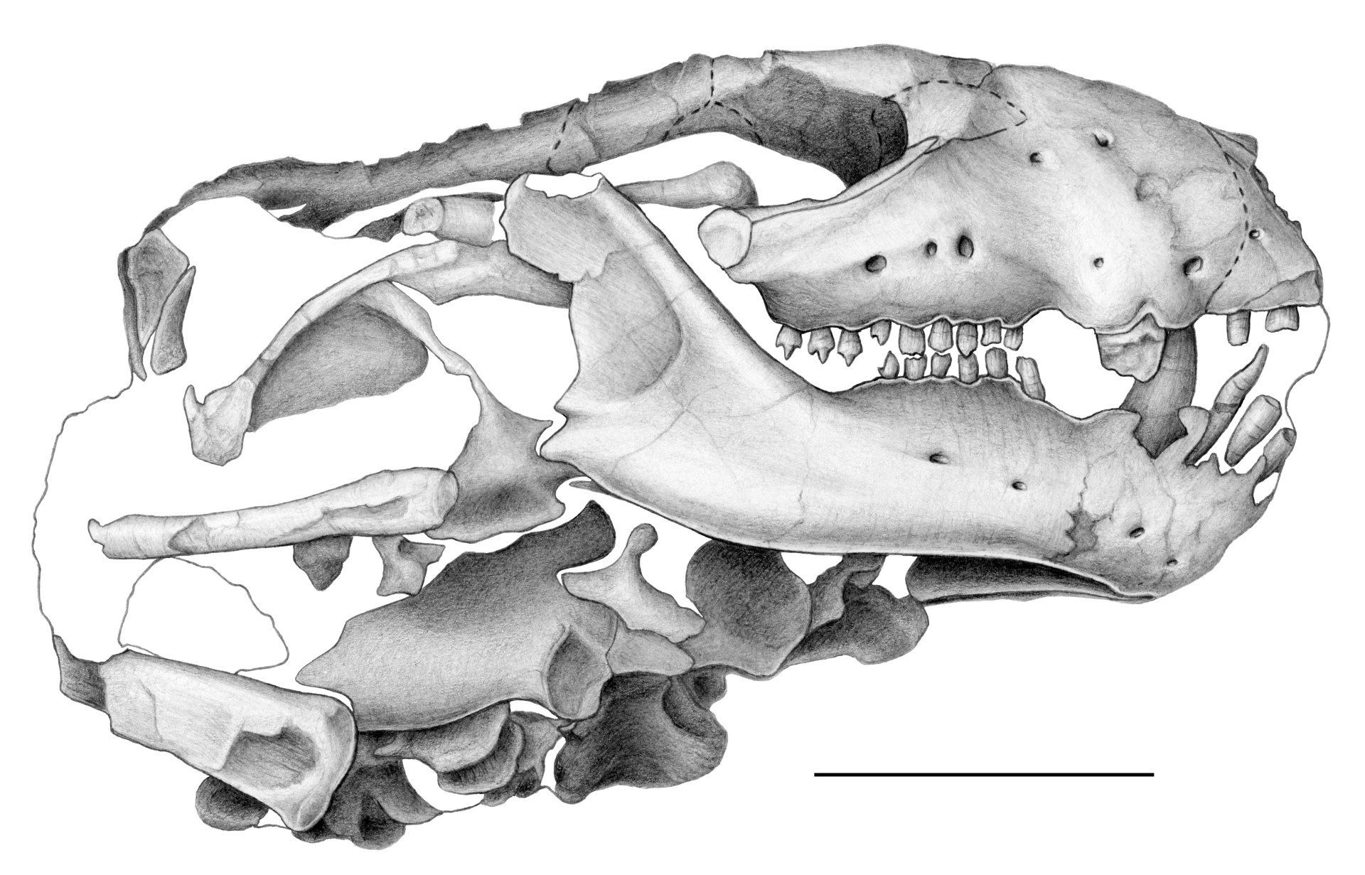 Cranium and mandible. Nshimbodon muchingaensis is mammalian precursor that lived 260 million years ago. Graphite on paper. Size 3.2 in x 6.1 in.