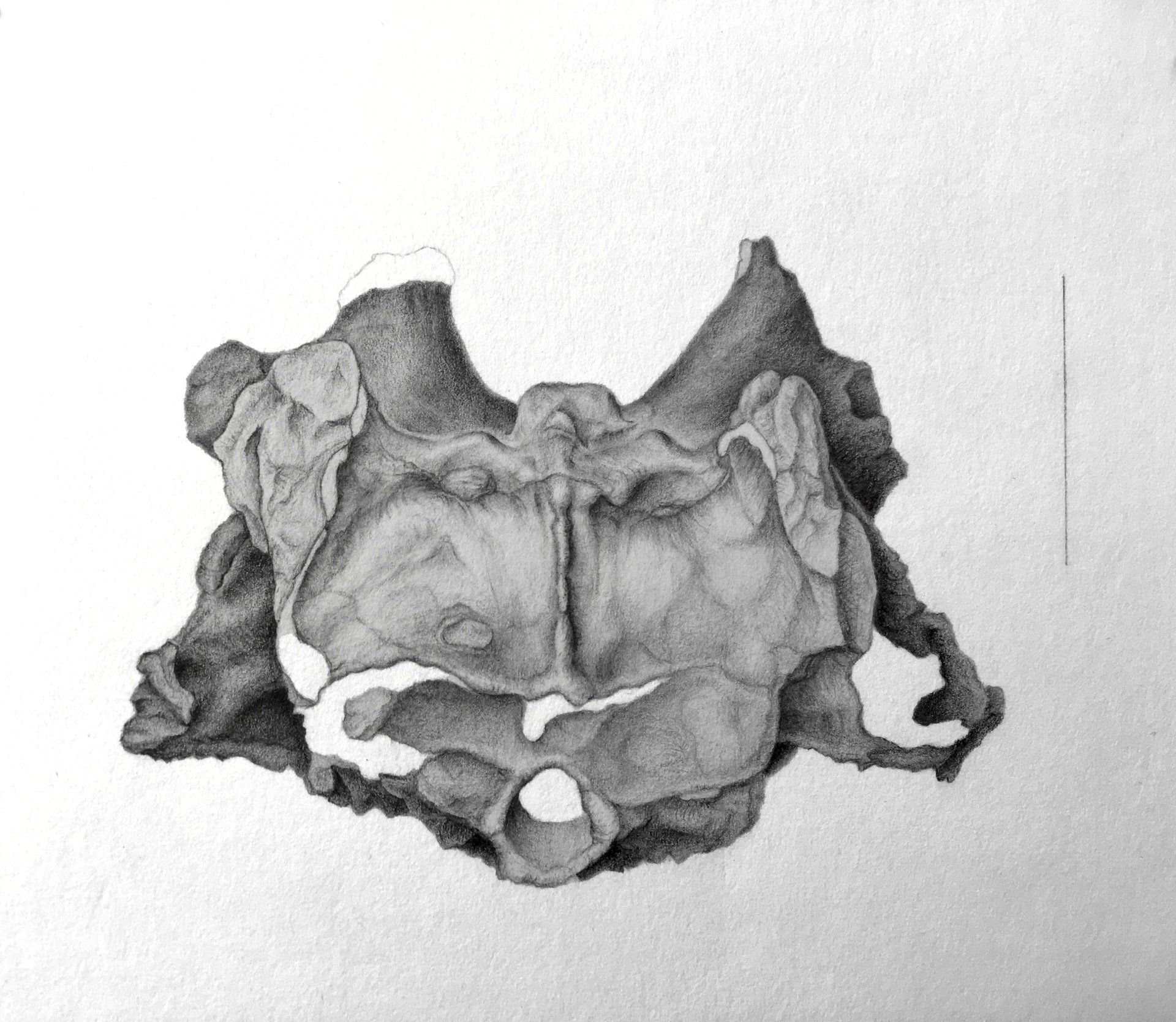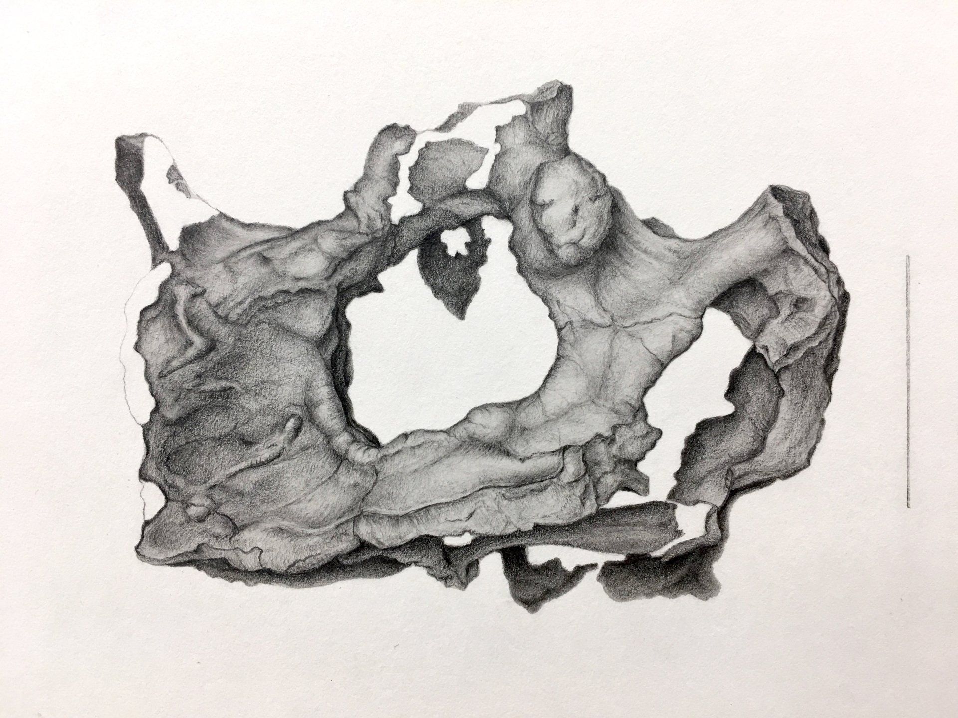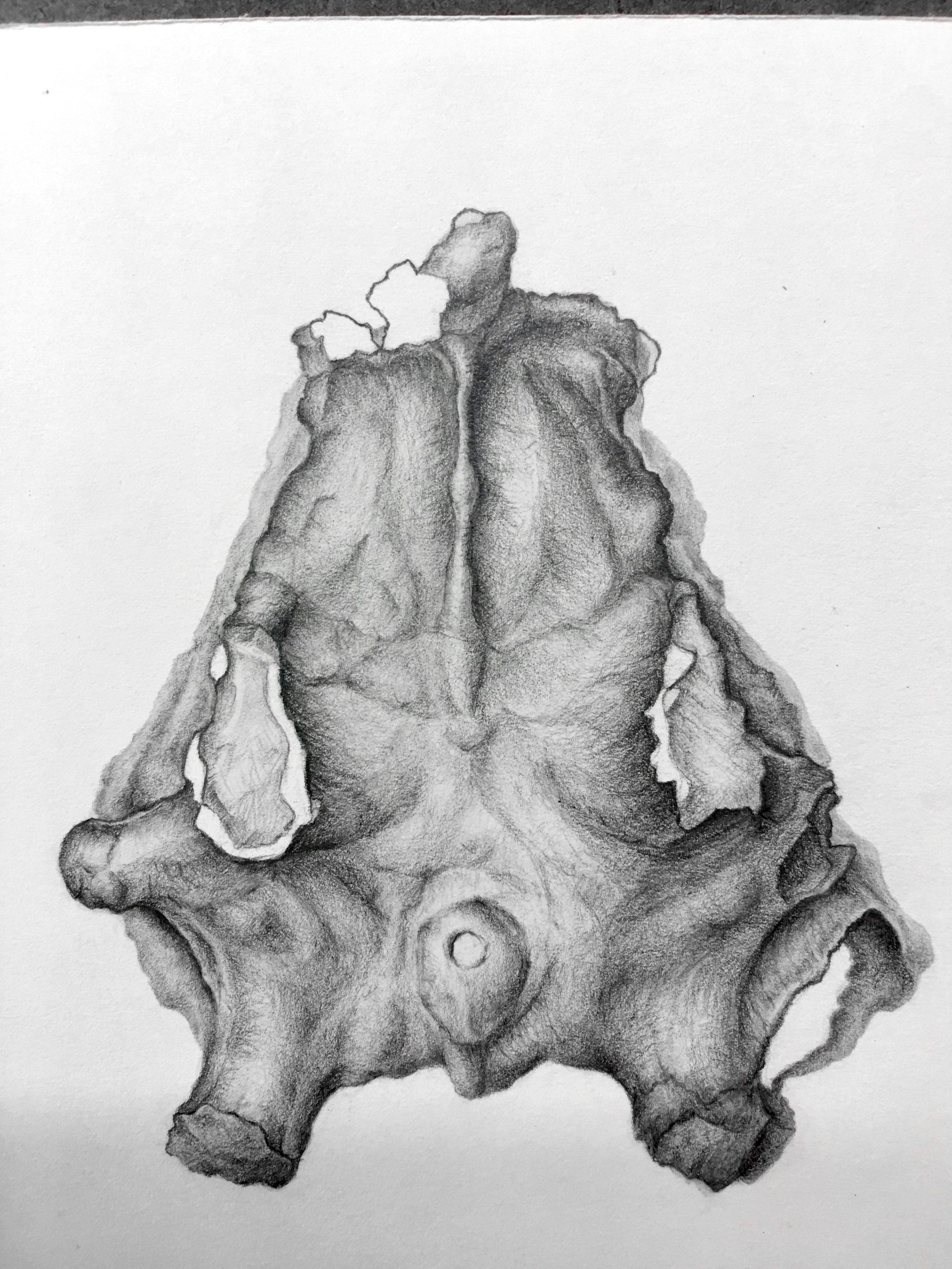 Foramen magnum. Nshimbodon muchingaensis is mammalian precursor that lived 260 million years ago. Graphite on paper. Size 2.1 in x 4.4 in.