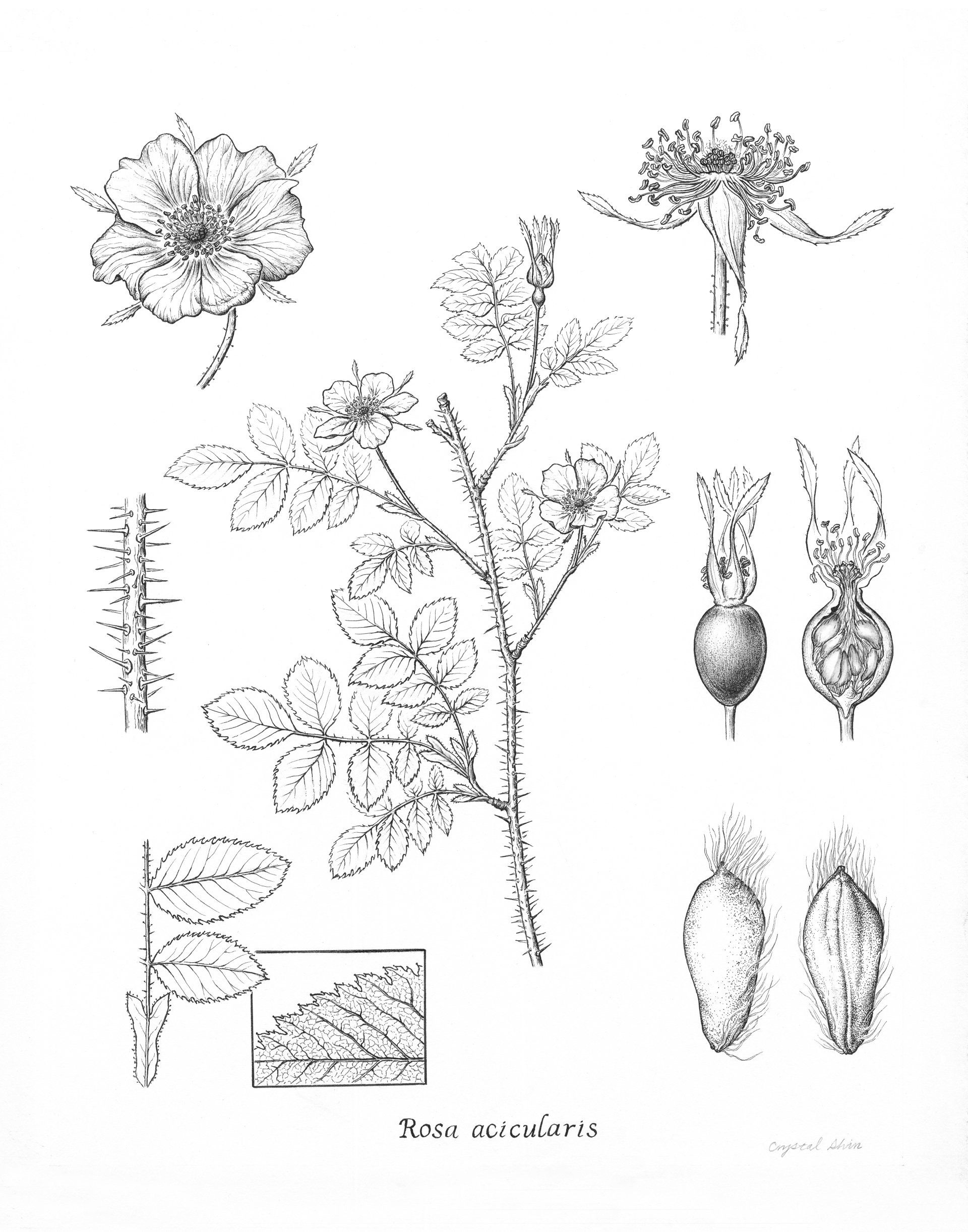 Prickly Wild Rose. Pen and ink on paper. Size 14 in x 11 in. Giclee print available.