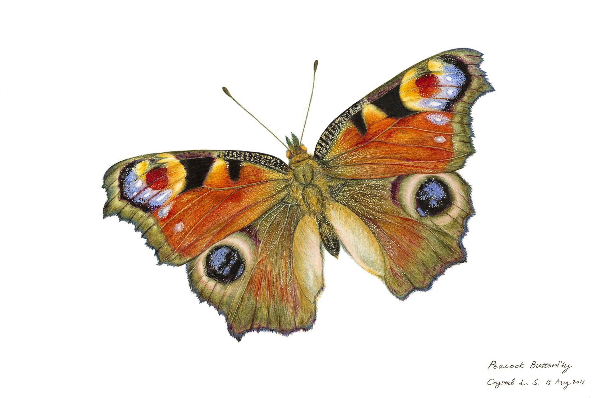 Aglais io, peacock butterfly, is a colourful butterfly, found in Europe and temperate Asia as far east as Japan. Colored pencil on paper. Size 8 in x 12 in. Giclee print available.